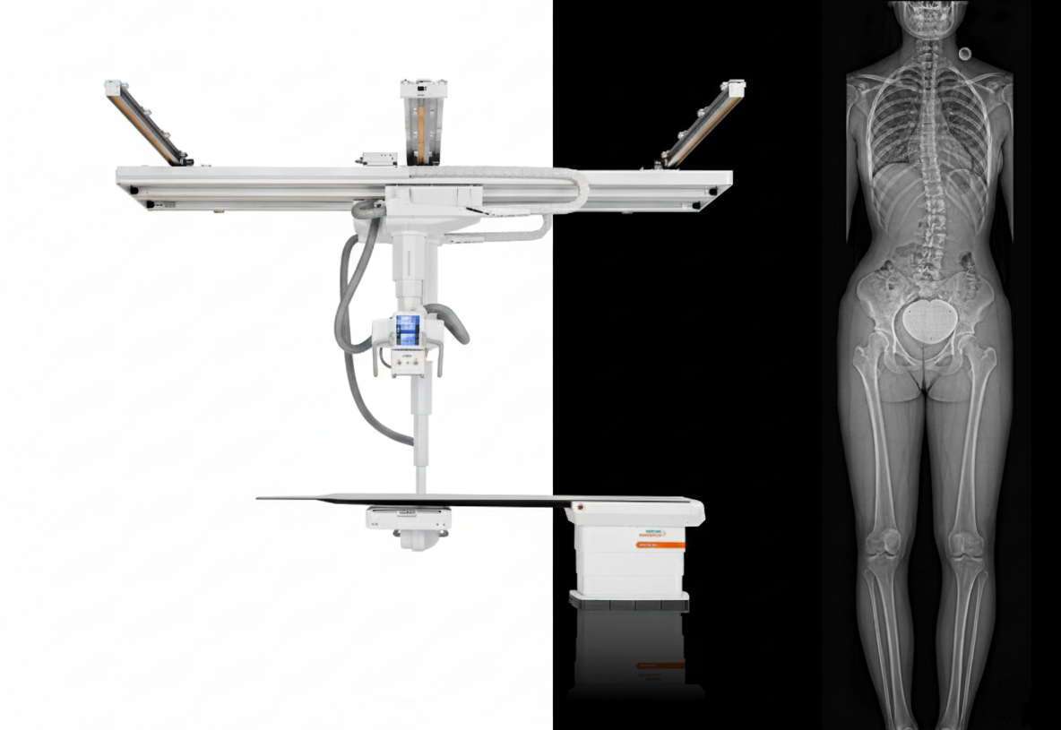 Geleneksel dijital radyografi sistemlerinde düz panelli dedektörlerin aktif alanının yaklaşık 43 × 43 cm ile sınırlı olması, omurga veya bacağın tamamının tek bir görüntüde ve ölçüm doğruluğu korunarak değerlendirilmesini zorlaştırır. Siemens Healthineers, bu klinik ihtiyaca True2scale yaklaşımıyla yanıt vererek uzun alan görüntülemede yeni bir standart sunuyor. Slot tarama tekniğine dayanan bu yaklaşımda, lineer dedektörle elde edilen yüksek derecede kolime edilmiş X-ışınları kullanılıyor. Özel rekonstrüksiyon algoritması, ışınlardaki küçük sapmaları hesaba katarak geometrik bozulma ve büyütme etkilerini etkin biçimde ortadan kaldırıyor. X-ışını kaynağı ve dedektörün vücut ekseni boyunca eş zamanlı ve paralel hareketi sayesinde, baştan ayağa uzanan görüntülerde dahi gerçek ölçekli sonuçlar elde edilebiliyor.